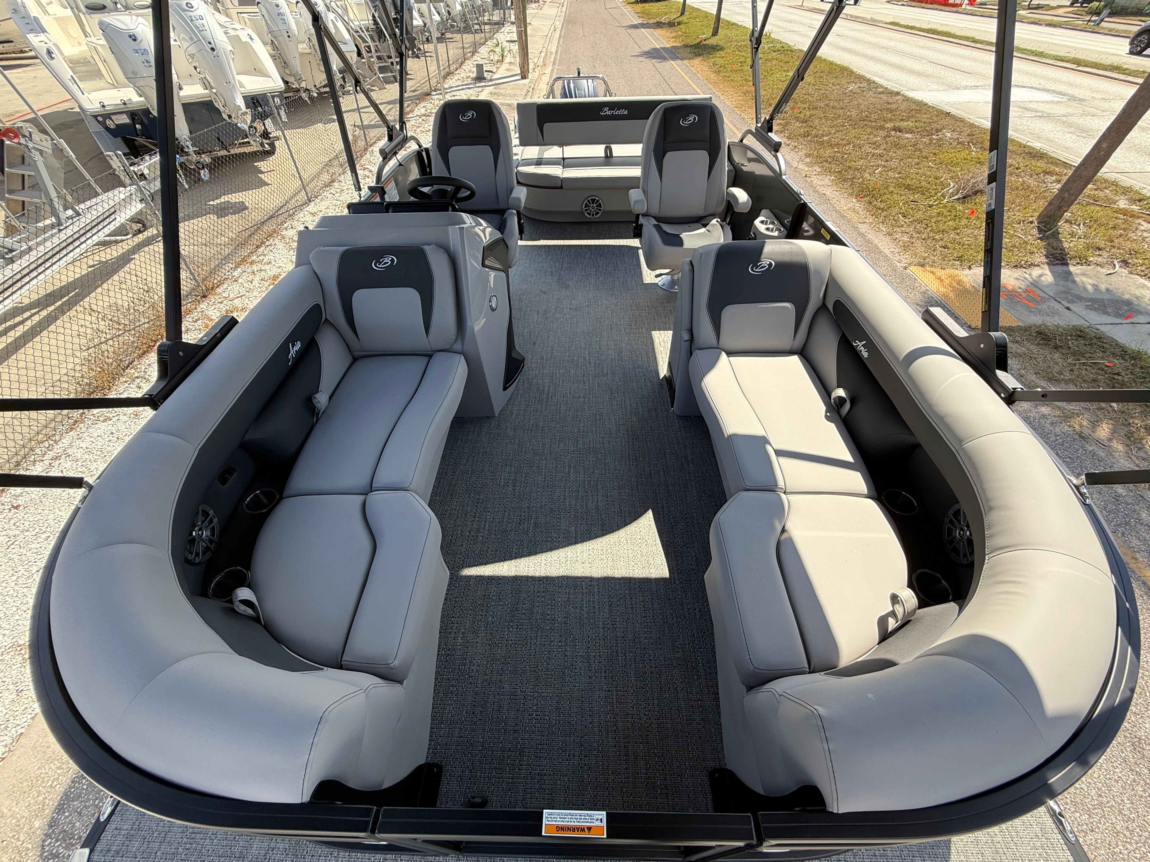 The Barletta Aria A22UC-Platinum is packed with premium features designed to enhance your boating experience. The Railskin Color Aria in Gray Moonstone and Railskin Accent Aria in Black Diamond create a visually stunning exterior, while the Blackout Package Aria adds a touch of modern sophistication. Inside, the Tempest Gray furniture offers plush seating and ample space for relaxation, complemented by the Amore Gray flooring that is both stylish and easy to maintain. The Coastal Edition Aria ensures this pontoon is ready for a variety of environments, from freshwater lakes to coastal waters. The Triple Toon Package Aria provides added stability and buoyancy, making every ride smooth and comfortable, even with a full crew on board.