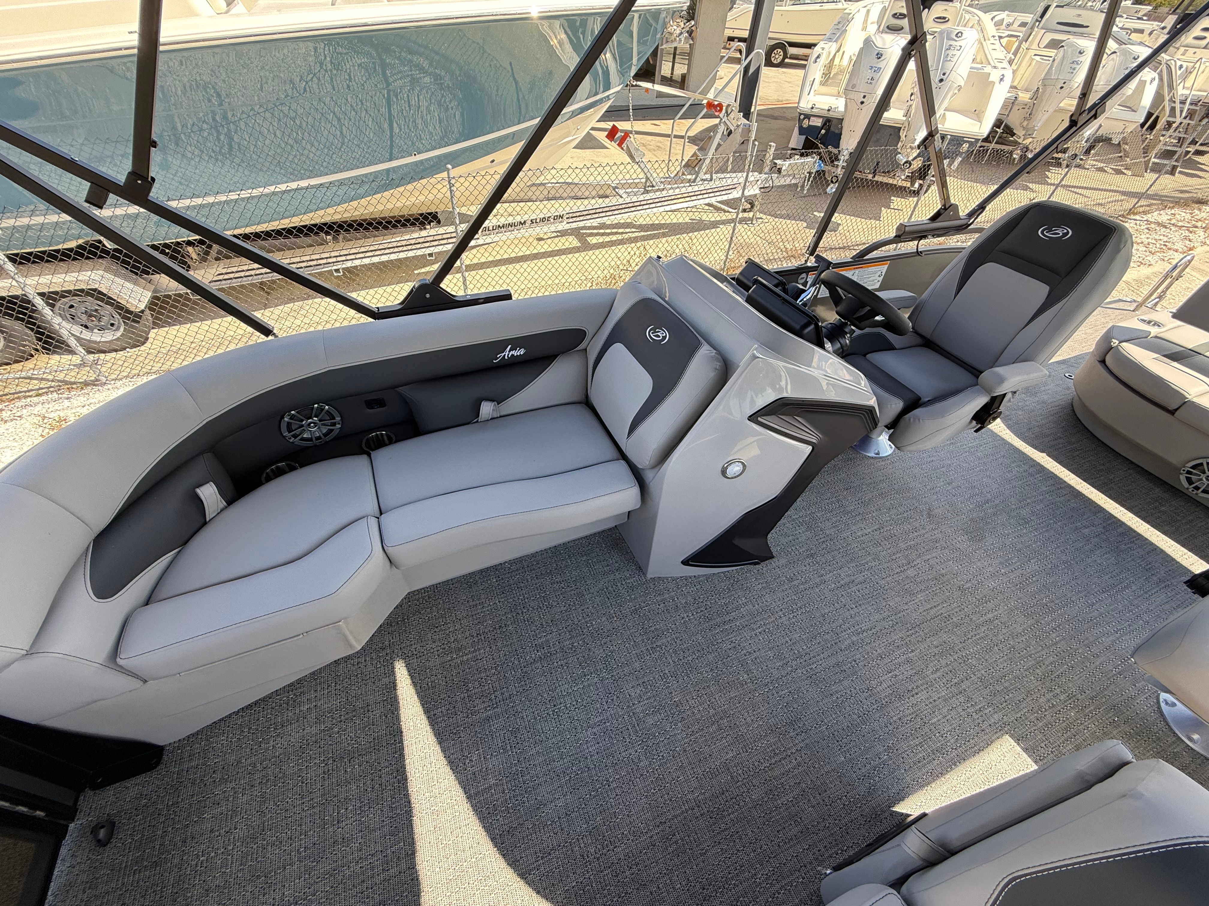 The 2026 Barletta Aria A22UC-Platinum is a brand-new pontoon boat that measures just over 21 feet in length, making it the perfect size for both intimate gatherings and lively parties on the water. Its modern profile is accentuated by the Railskin Color Aria in Gray Moonstone and the Railskin Accent Aria in Black Diamond, giving it a sophisticated and contemporary look that is sure to turn heads at any marina or lakefront. The Blackout Package Aria further enhances its visual appeal, creating a striking contrast that exudes elegance and style.
