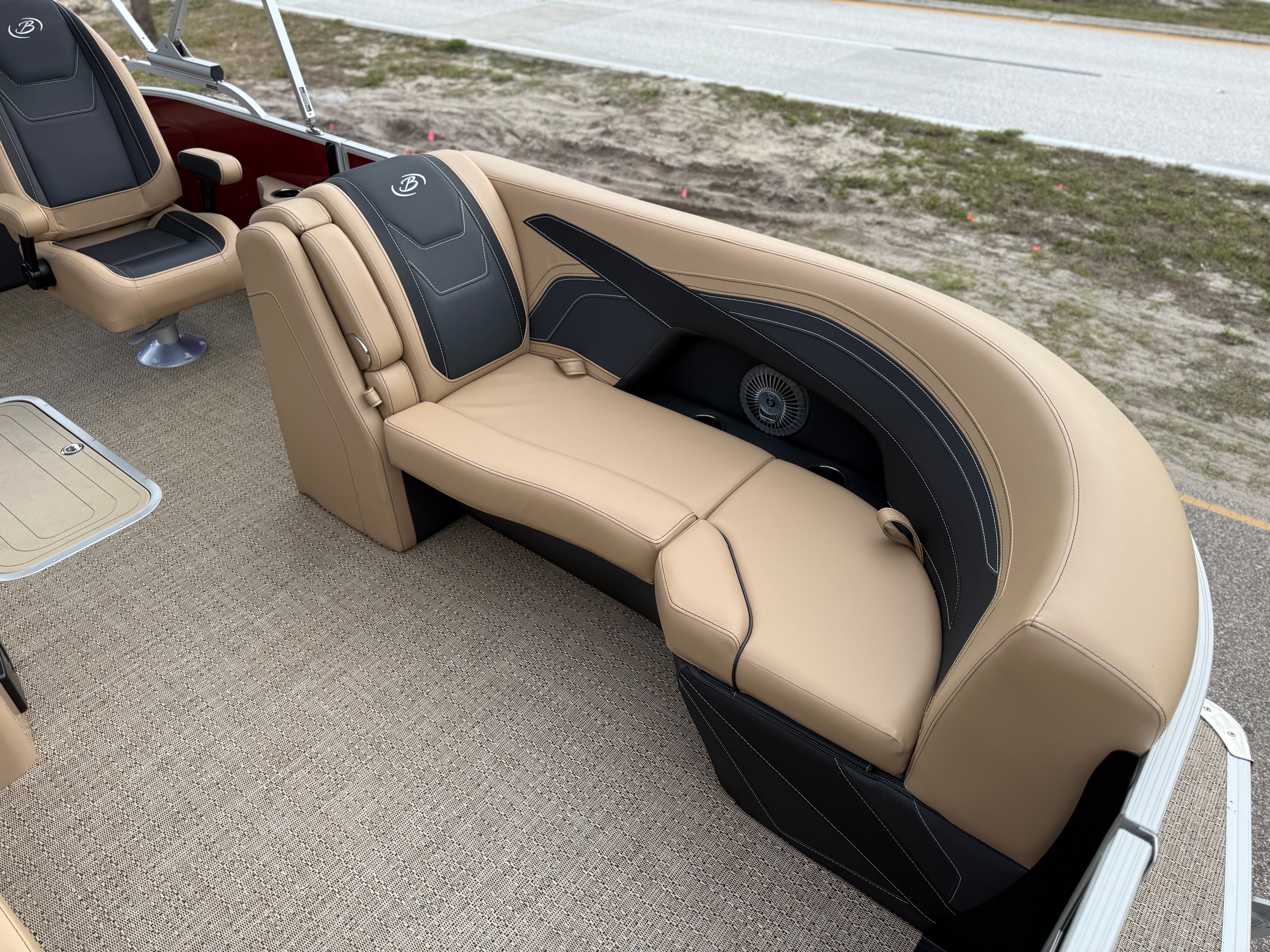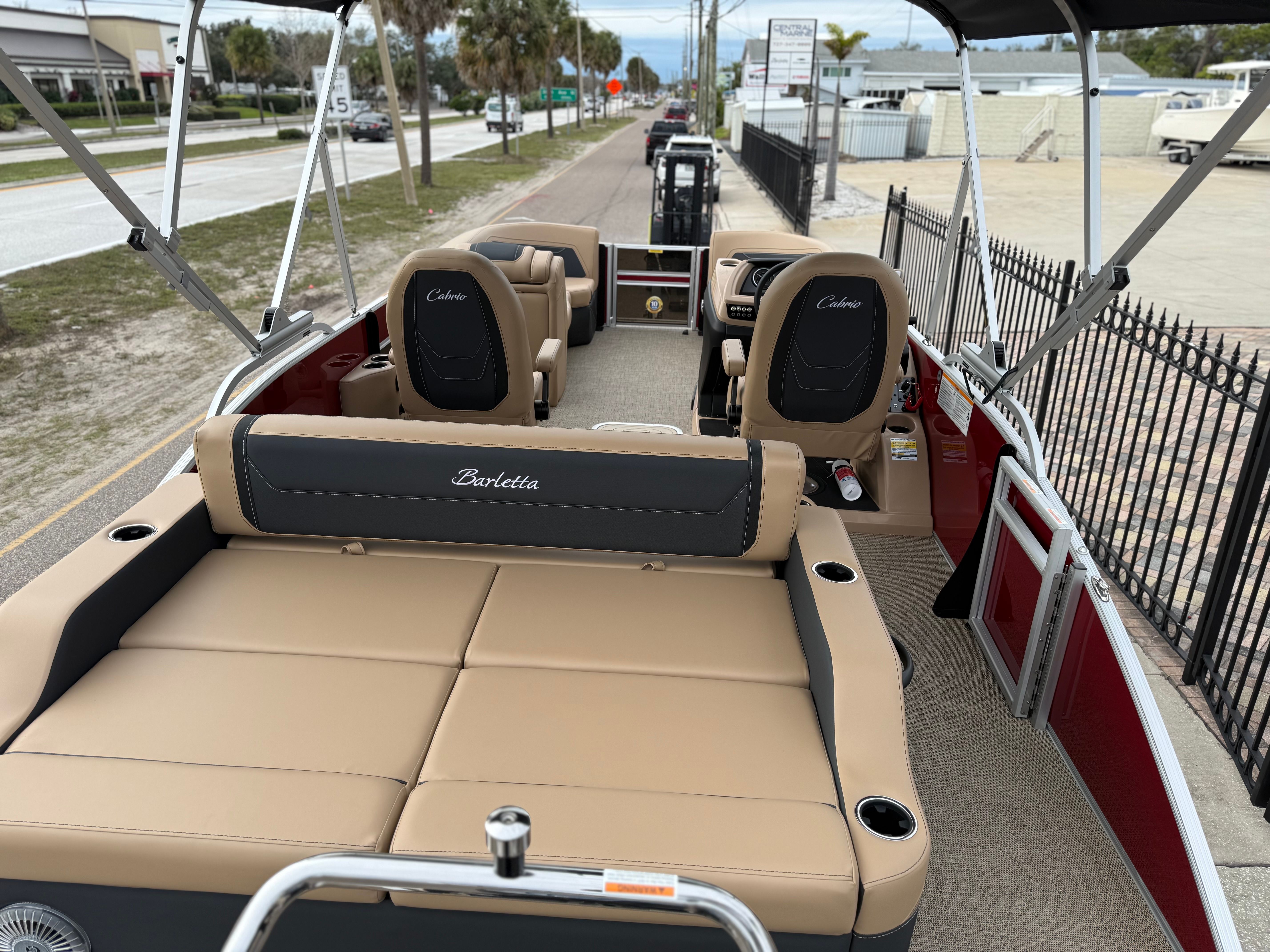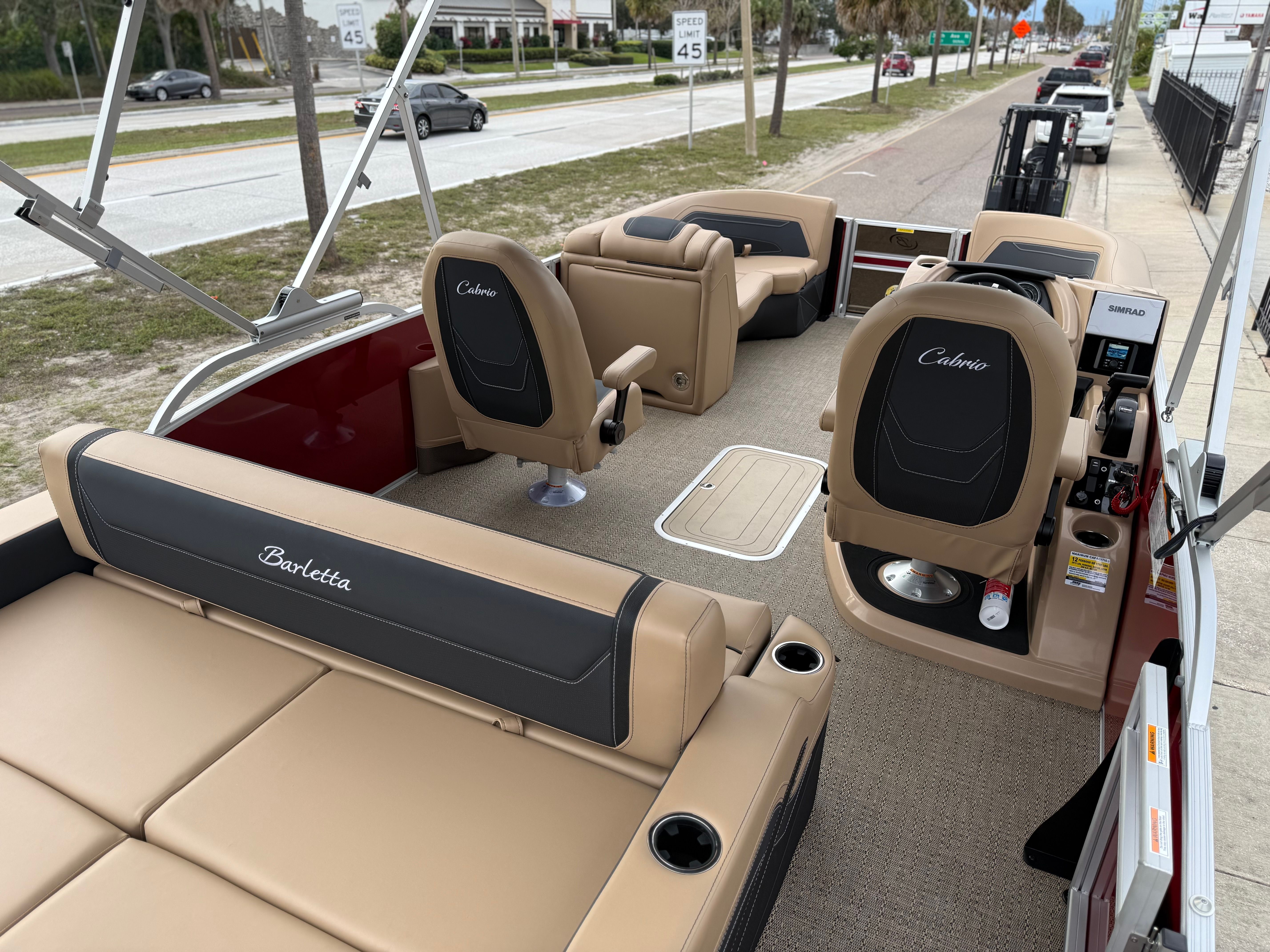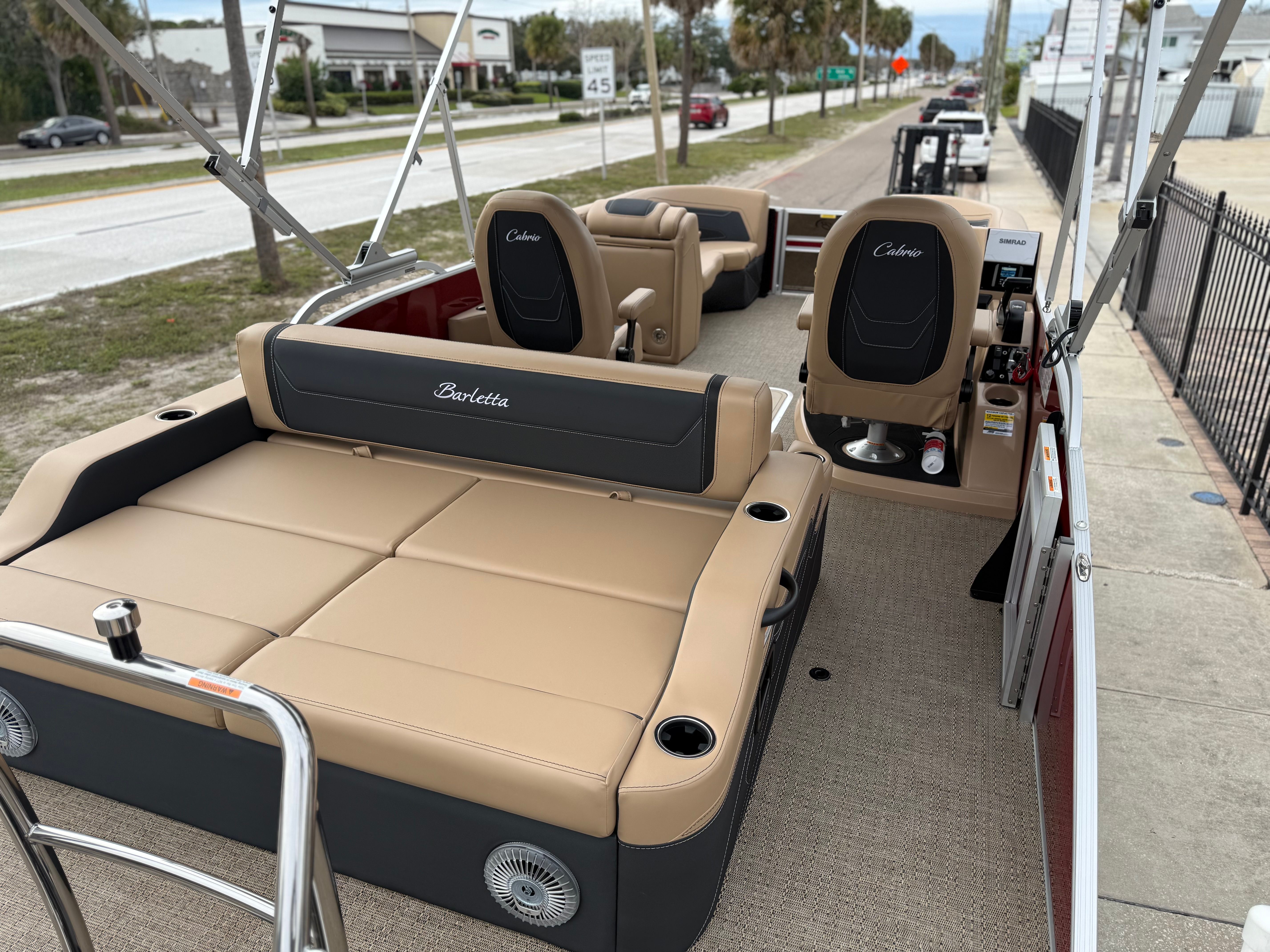 The 2026 Barletta Cabrio C22UC comes loaded with features designed to maximize comfort, convenience, and fun. The Champagne Railskin color with Red Garnet accent creates a sophisticated and sporty look, while the Carmella Tan with Onyx furniture offers plush seating for all your guests. The Amore Tan flooring is both stylish and practical, providing a comfortable surface that is easy to clean and maintain. The Coastal Edition Cabrio package adds versatility for a range of water environments, and the Triple Toon Package with Midship Storage increases stability and storage capacity, making it easy to bring along all your essentials for a day on the water.For navigation and entertainment, the Simrad 7" G07 XSR Chartplotter/Multifunction Display is ready to guide your adventures, offering advanced charting and multifunction capabilities. Please note, engine communication is not included and may require dealer installation if desired. The Yamaha mechanical pre-rig and stainless steel prop ensure that your engine setup is both efficient and reliable, giving you peace of mind as you cruise.