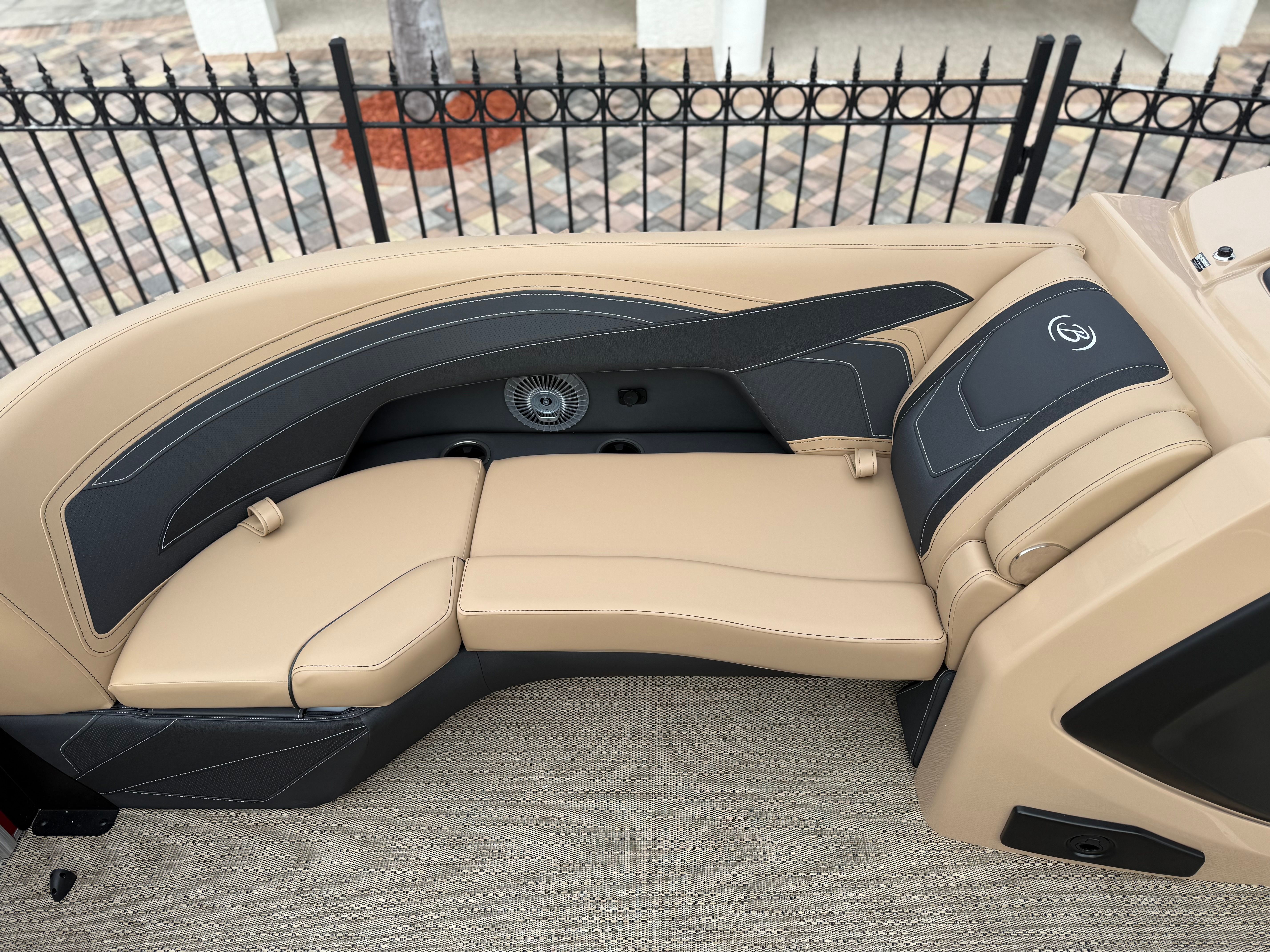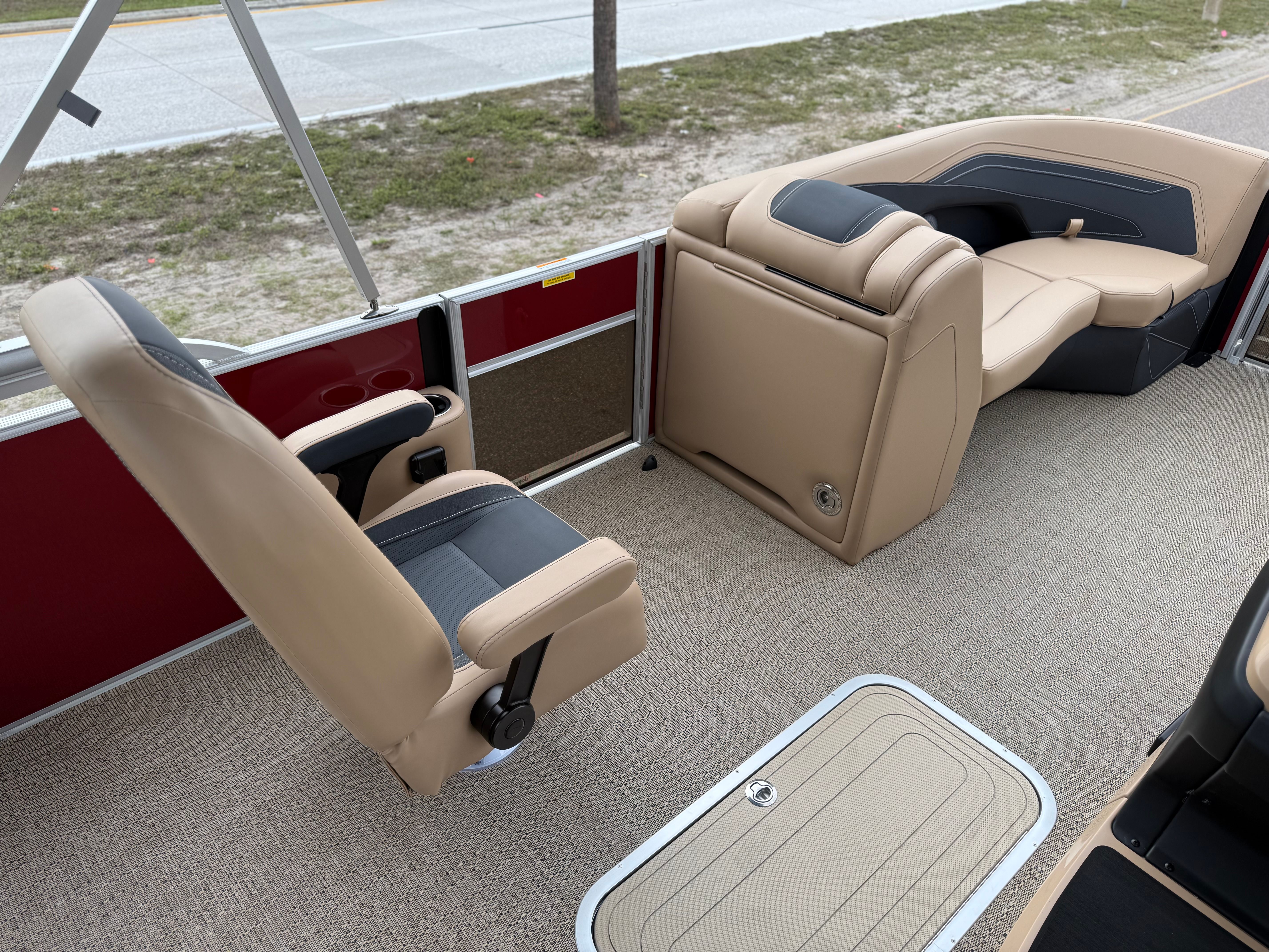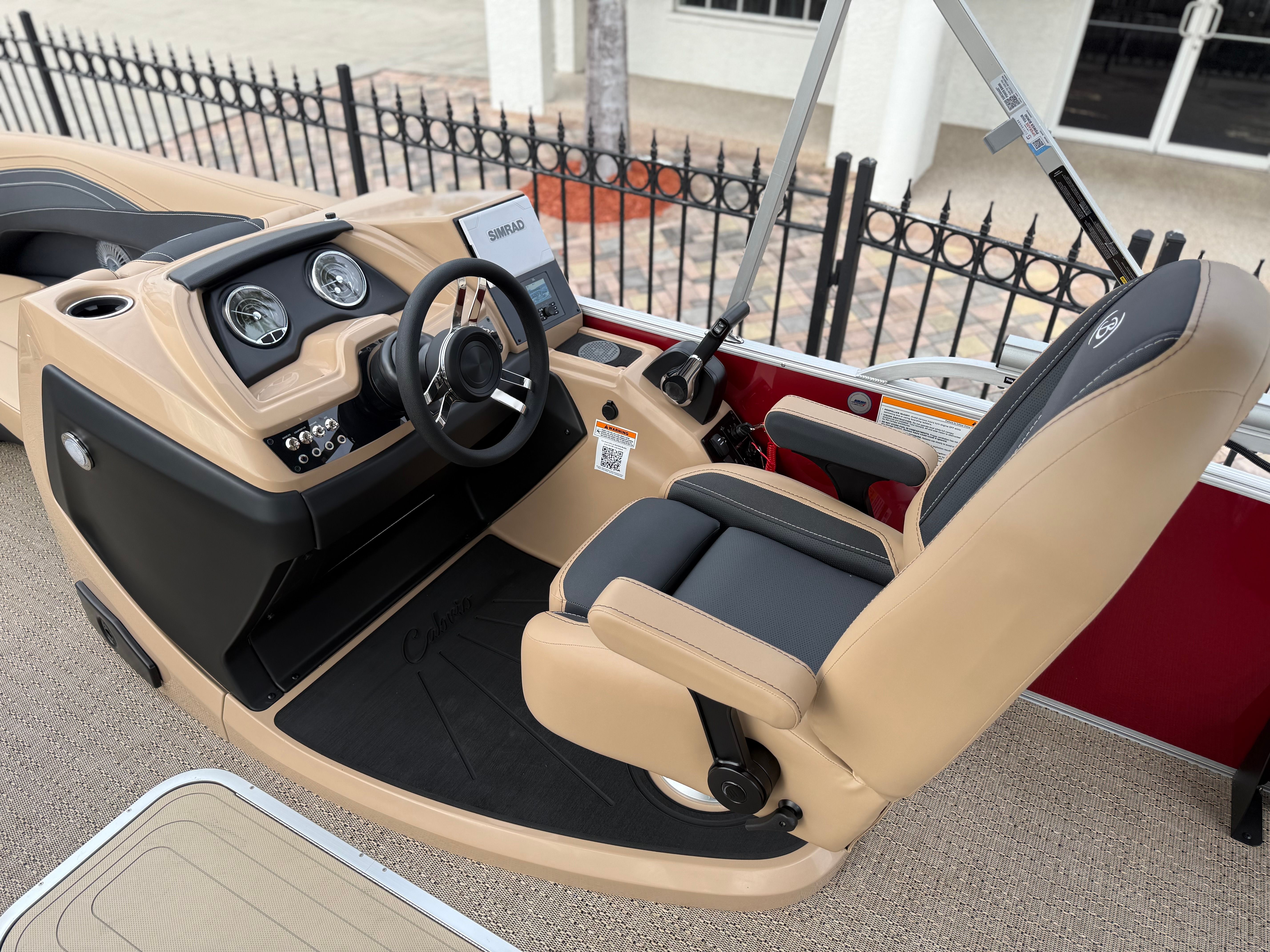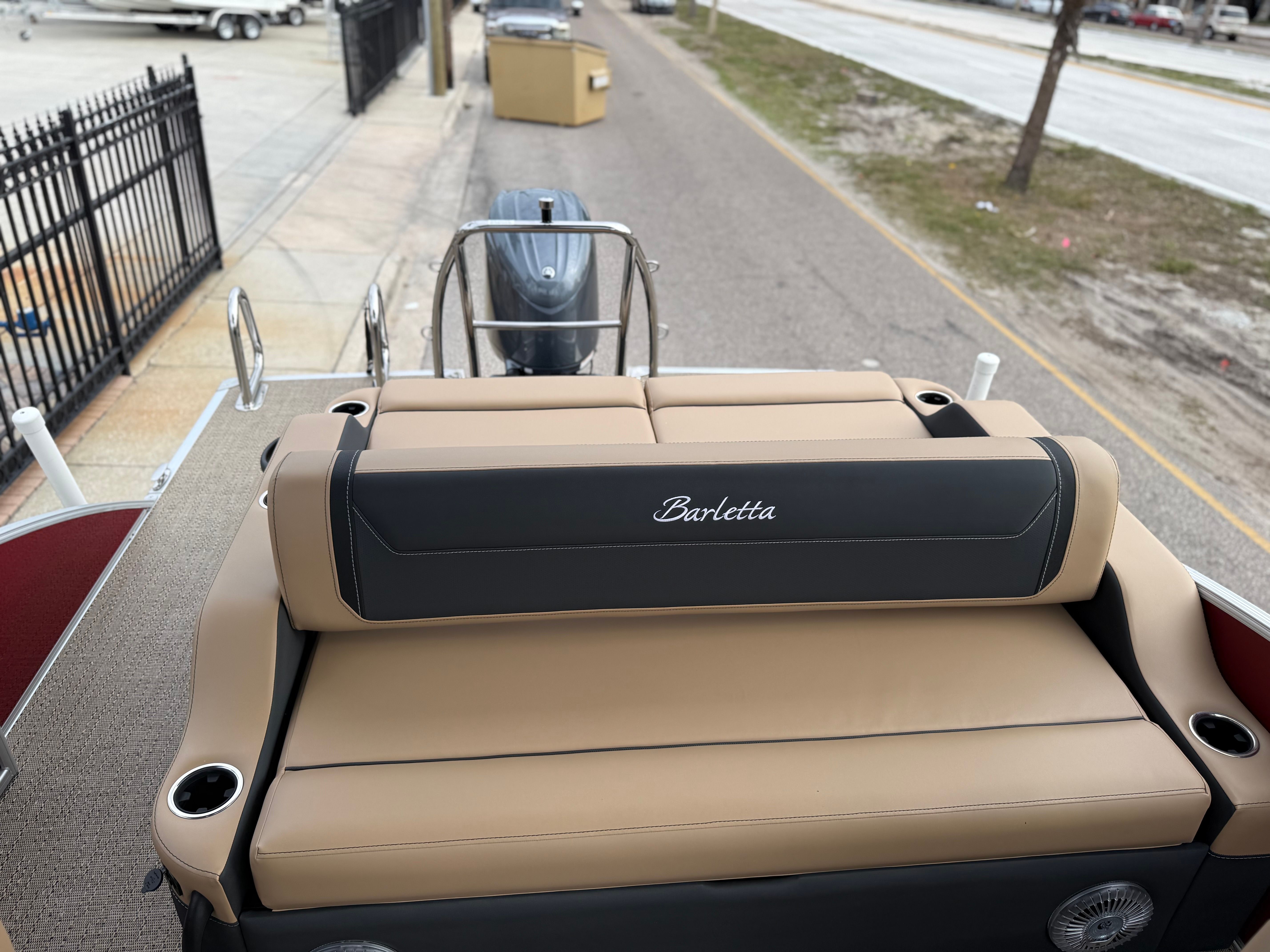 The 2026 Barletta Cabrio C22UC comes loaded with features designed to maximize comfort, convenience, and fun. The Champagne Railskin color with Red Garnet accent creates a sophisticated and sporty look, while the Carmella Tan with Onyx furniture offers plush seating for all your guests. The Amore Tan flooring is both stylish and practical, providing a comfortable surface that is easy to clean and maintain. The Coastal Edition Cabrio package adds versatility for a range of water environments, and the Triple Toon Package with Midship Storage increases stability and storage capacity, making it easy to bring along all your essentials for a day on the water.For navigation and entertainment, the Simrad 7" G07 XSR Chartplotter/Multifunction Display is ready to guide your adventures, offering advanced charting and multifunction capabilities. Please note, engine communication is not included and may require dealer installation if desired. The Yamaha mechanical pre-rig and stainless steel prop ensure that your engine setup is both efficient and reliable, giving you peace of mind as you cruise.
