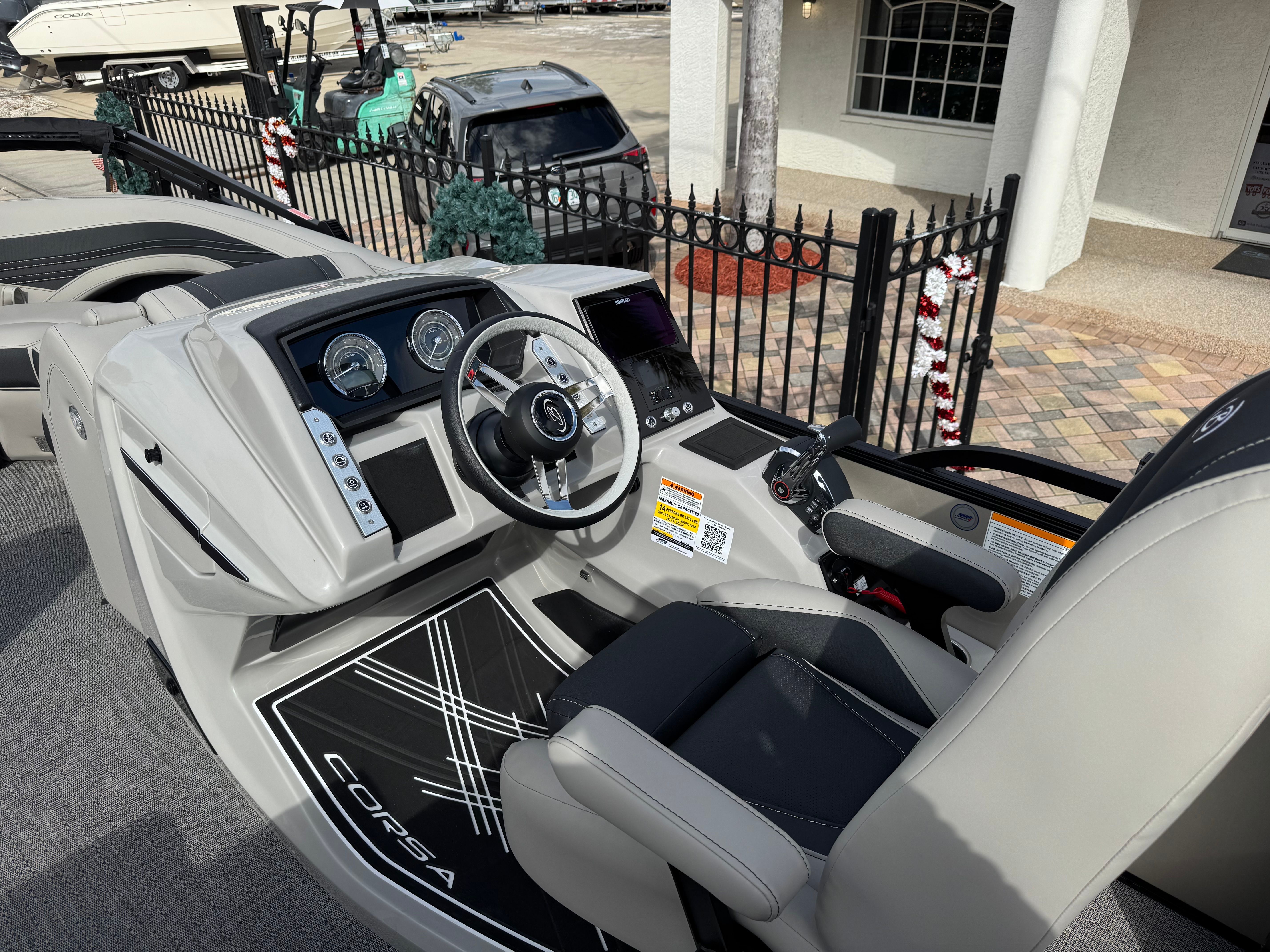 The Barletta Corsa 25UE is loaded with premium features that elevate your time on the water. The Railskin color in Champagne, accented by Red Garnet, creates a head-turning aesthetic that is both modern and timeless. The Blackout Package Corsa adds a sleek, sophisticated touch, enhancing the boat's visual appeal. Inside, the Soft Touch Marquesan Gray furniture with Carbon Accent offers plush seating and a luxurious feel, ensuring maximum comfort for you and your guests. The Amore Gray flooring is both stylish and practical, providing a durable and easy-to-clean surface.This model is part of the Coastal Edition Corsa, designed to withstand the rigors of saltwater environments while maintaining its beauty and performance. The double bimini, including an additional power bimini, provides ample shade and protection from the sun, allowing you to enjoy long days on the water in comfort. With digital gauges and advanced rigging, the Corsa 25UE offers a modern, user-friendly boating experience.